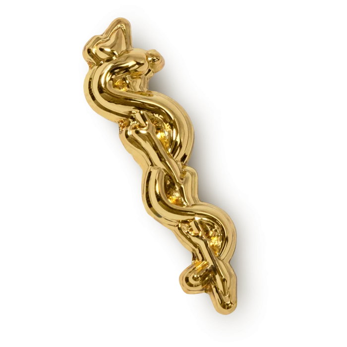 Insigna Medicina Toiagul lui Esculap este un simbol clasic al științelor medicale, recunoscut la nivel internațional. Realizată din metal auriu în relief, cu detalii fine și proporții echilibrate, această insignă reprezintă un baston în jurul căruia este încolăcit un șarpe – imaginea tradițională a vindecării, cunoașterii și echilibrului interior. Toiagul lui Esculap este simbolul medicinei autentice, înrădăcinat în mitologia greacă și preluat ca emblemă de instituțiile medicale din întreaga lume.